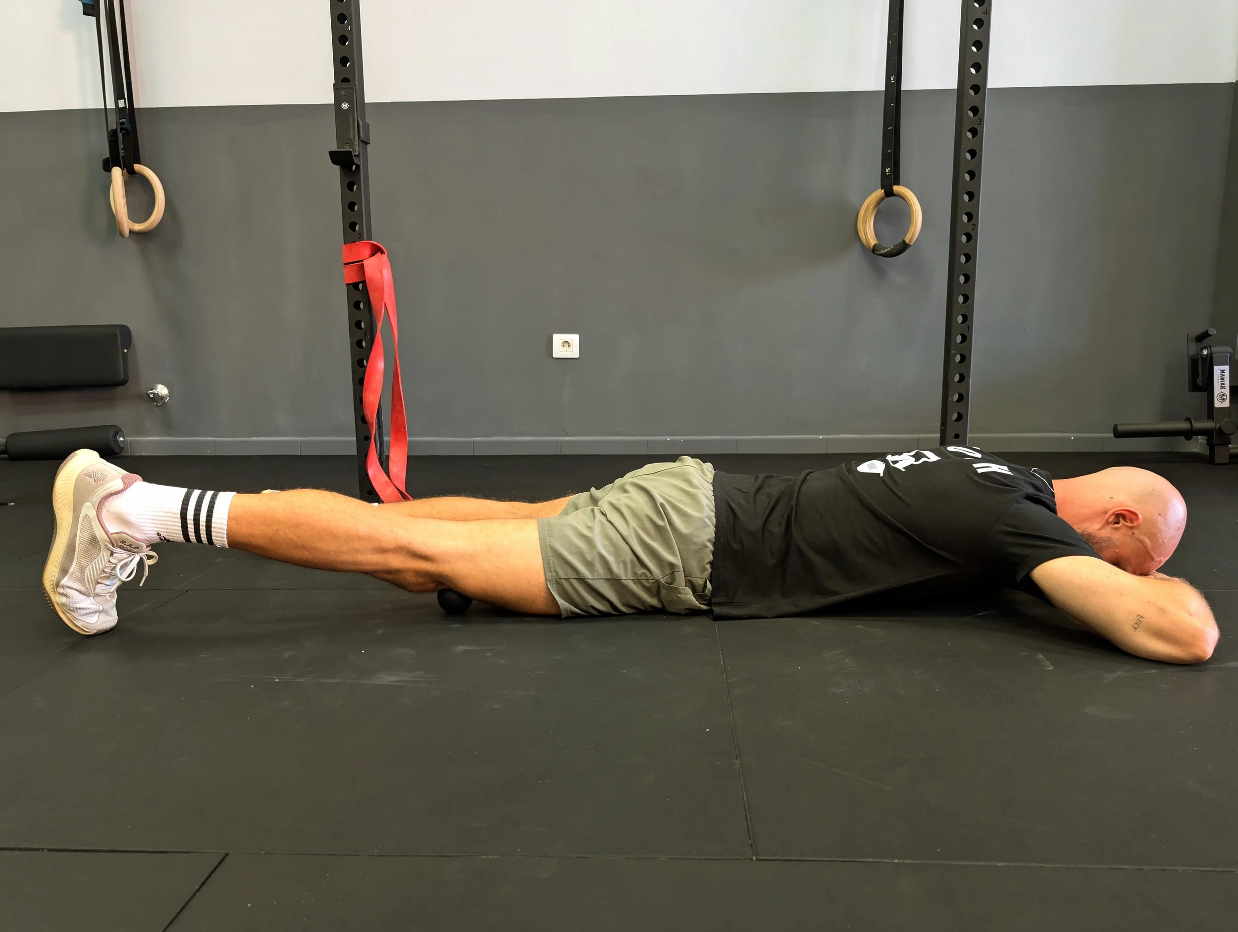 How: Lie face down. Place a small ball just above your kneecap (on the inside, middle, or outside). Relax your weight onto the ball.